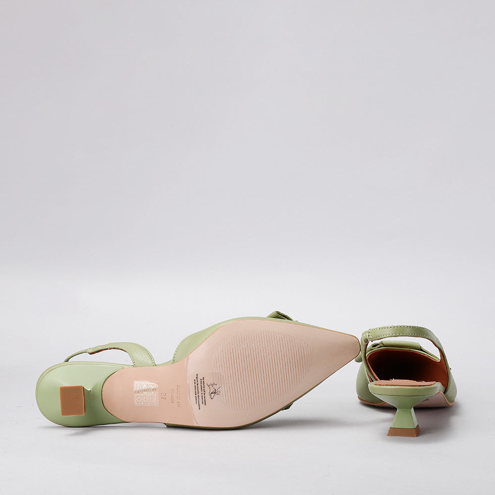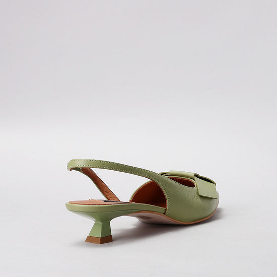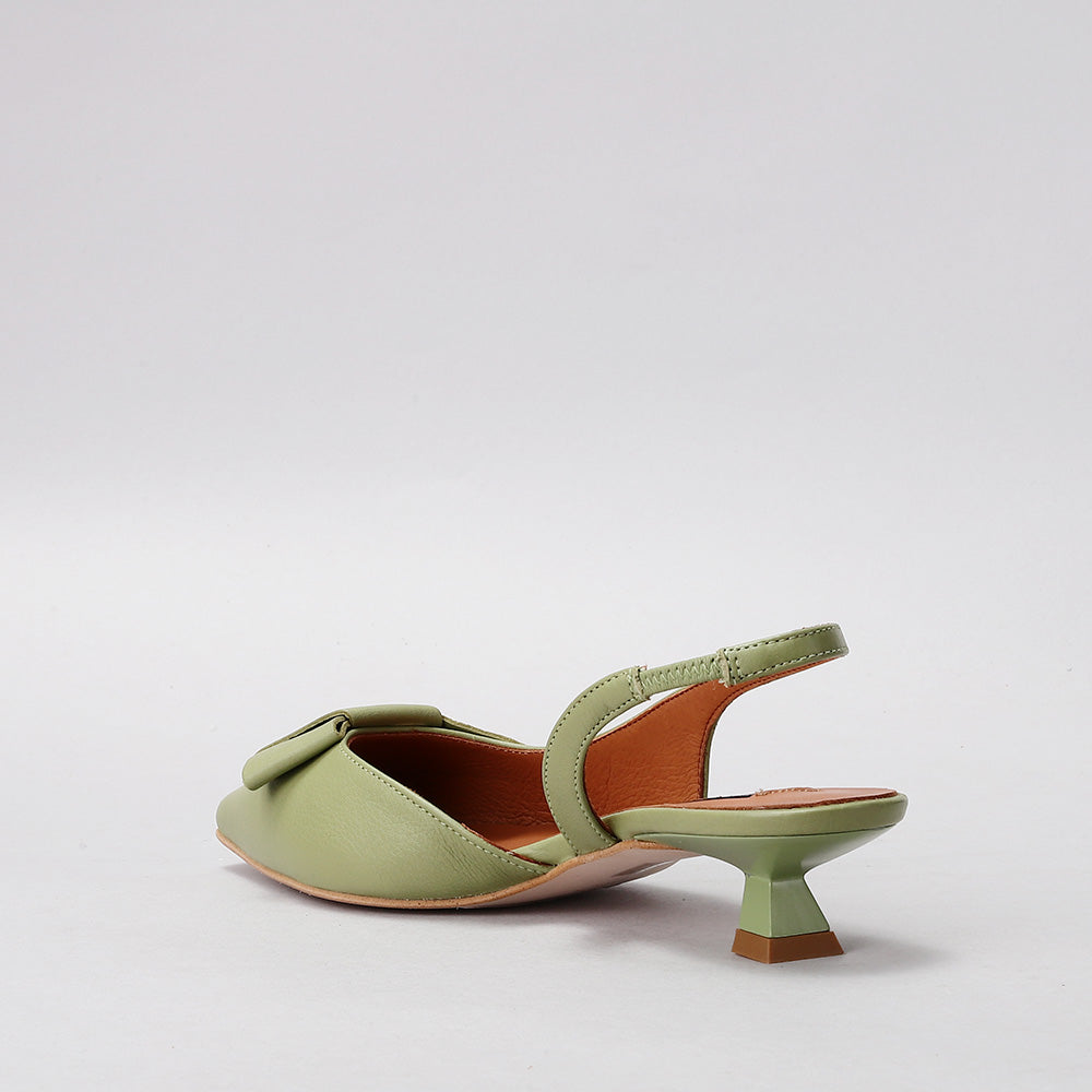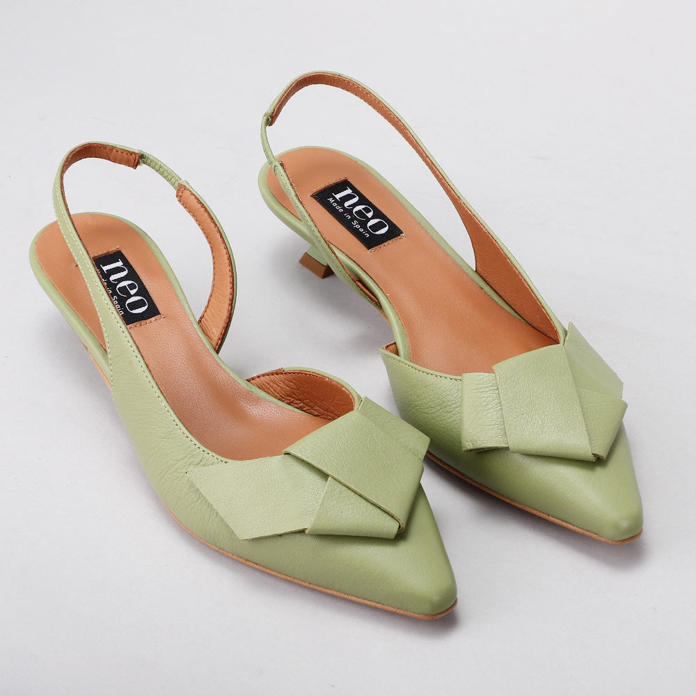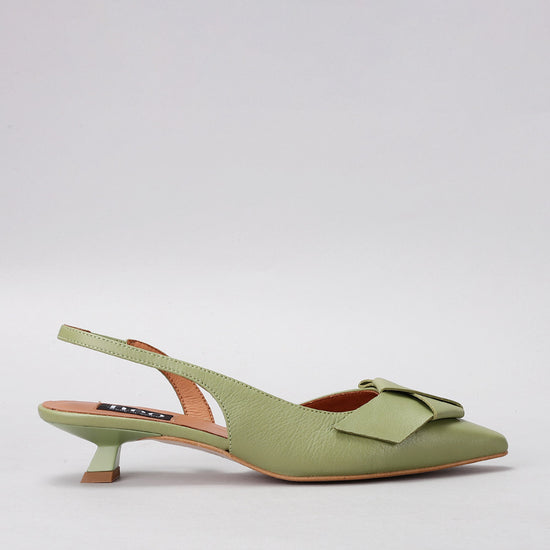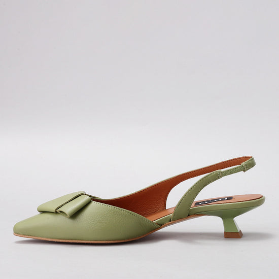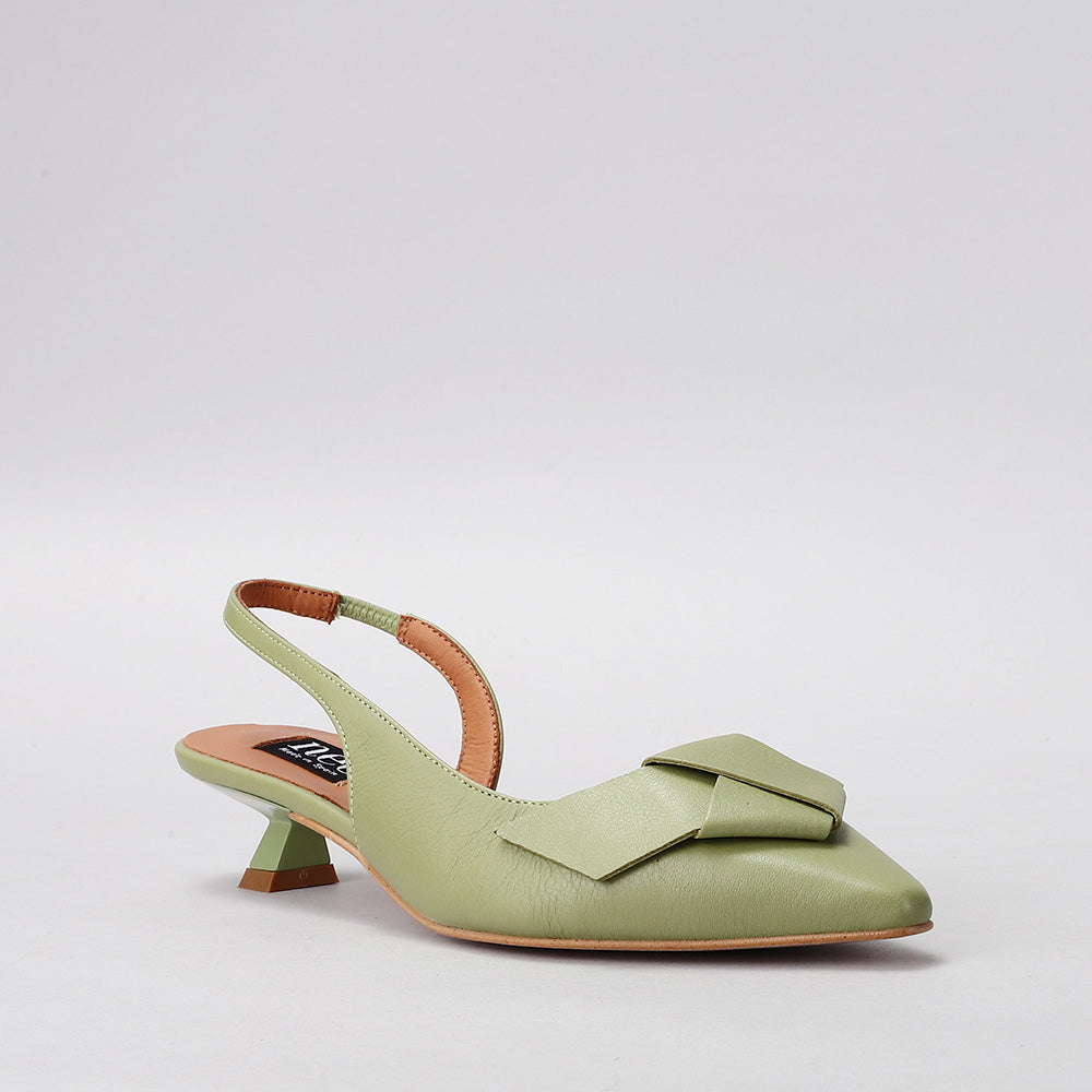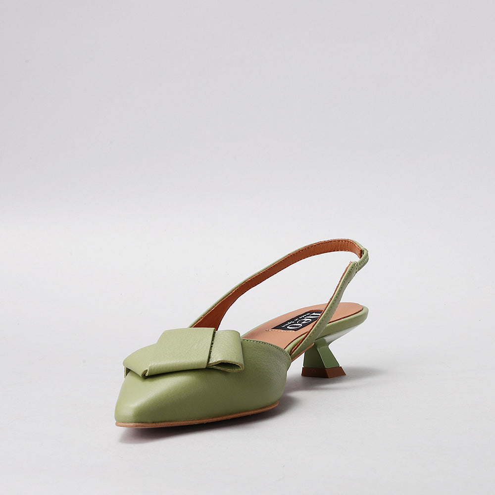 This is an elegant ivory slingback kitten heel shoe featuring a pointed toe and a large decorative bow on the front. The design includes a low, uniquely shaped heel for a chic and modern touch, while the neutral colour makes it versatile for various outfits and occasions.