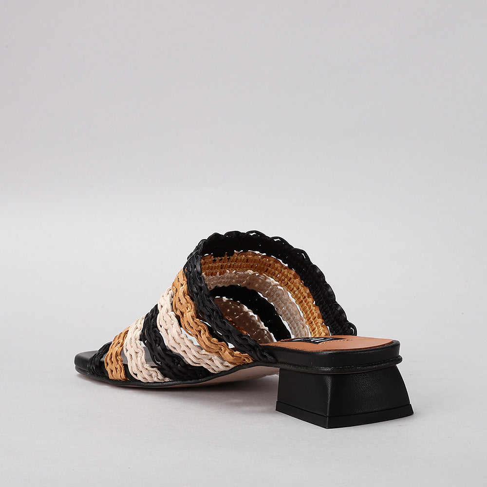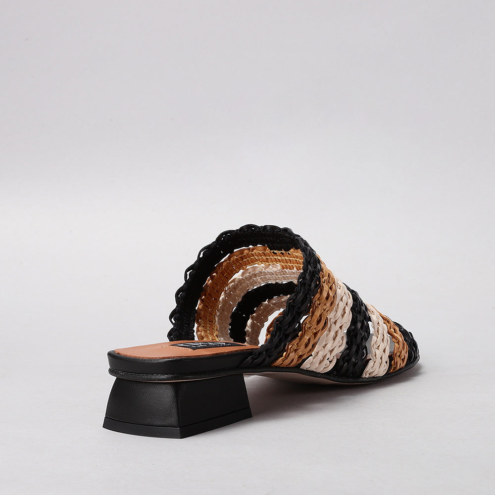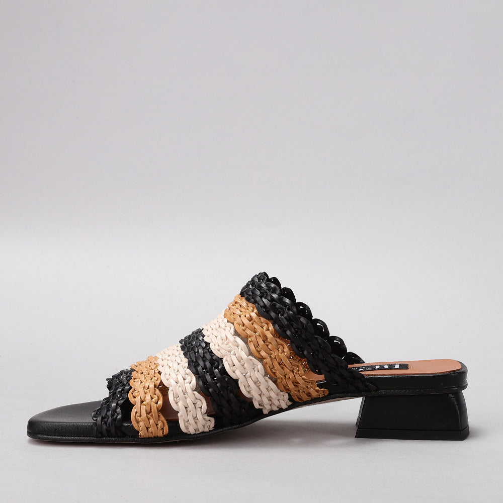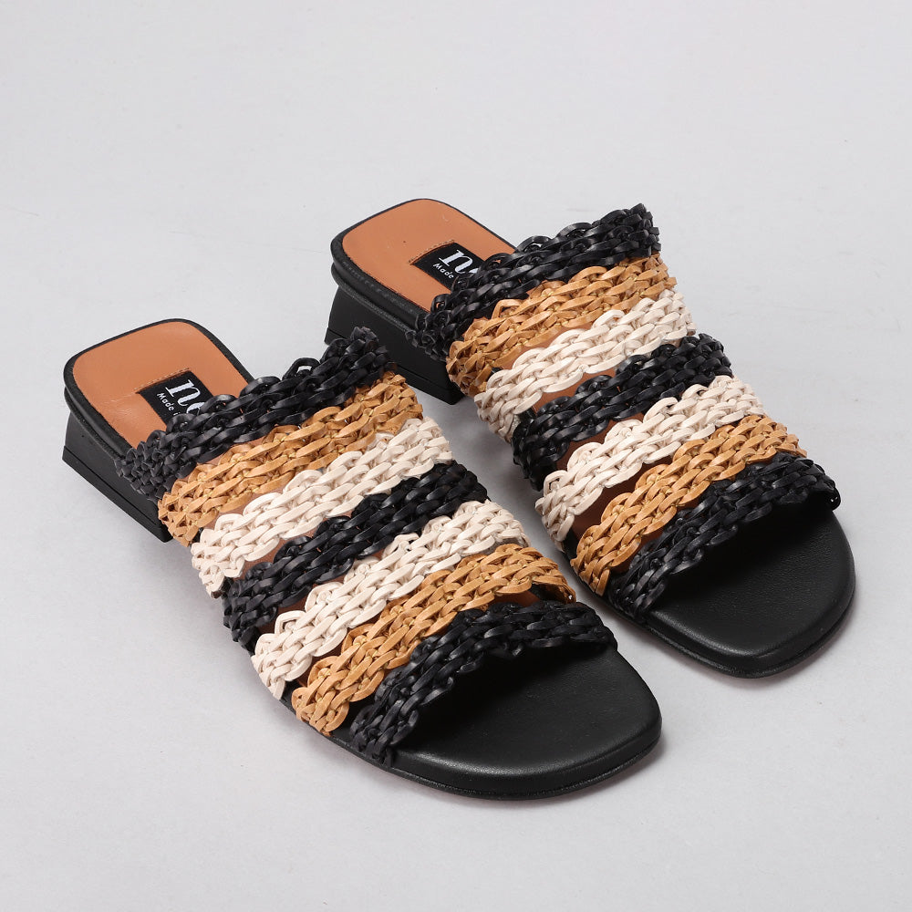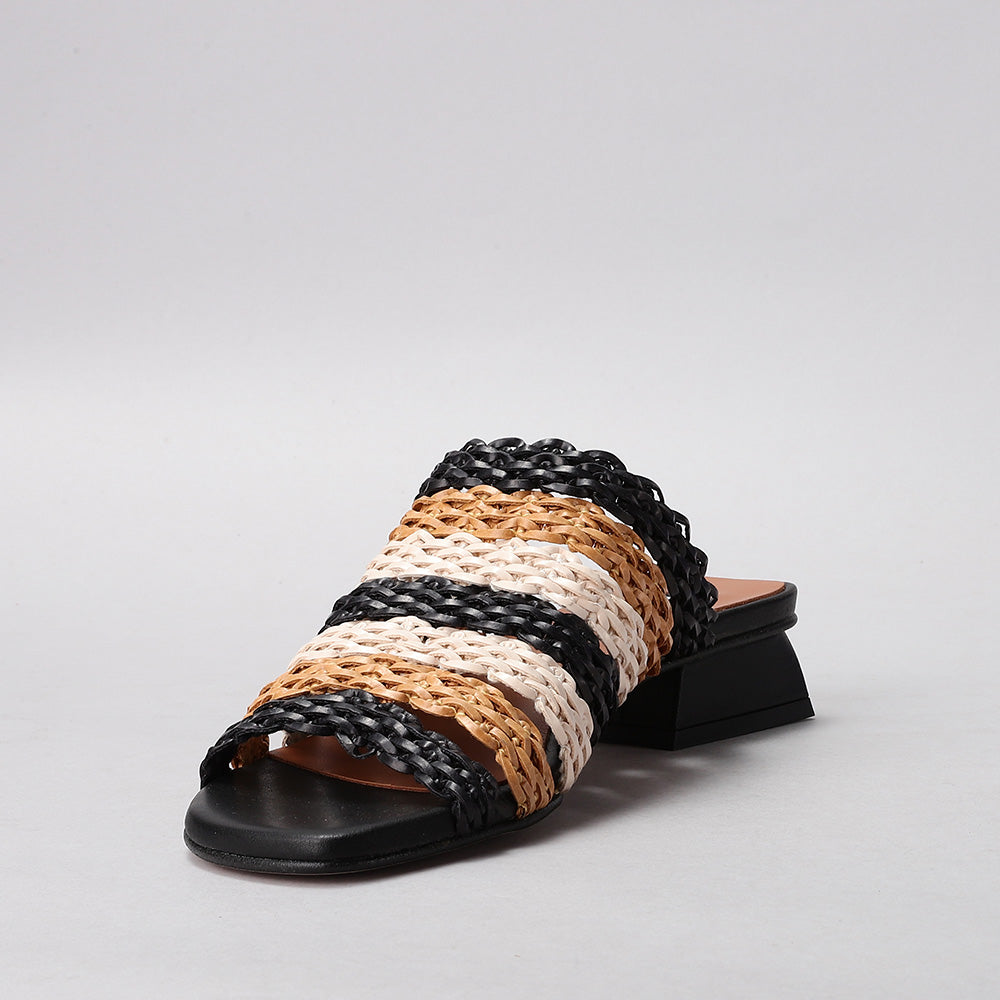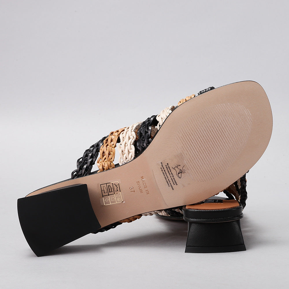 This is a chic woven mule sandal crafted in a natural raffia-style material. The upper features an open-weave braided design that gives it a breezy, summery appeal while allowing breathability. It has an open toe for a relaxed fit and an easy slip-on style for convenience. The sandal is set on a modern, low block heel with a geometric cut, adding a contemporary touch and subtle lift without sacrificing comfort. Perfect for warm-weather outings, this design combines casual elegance with everyday wearability.
