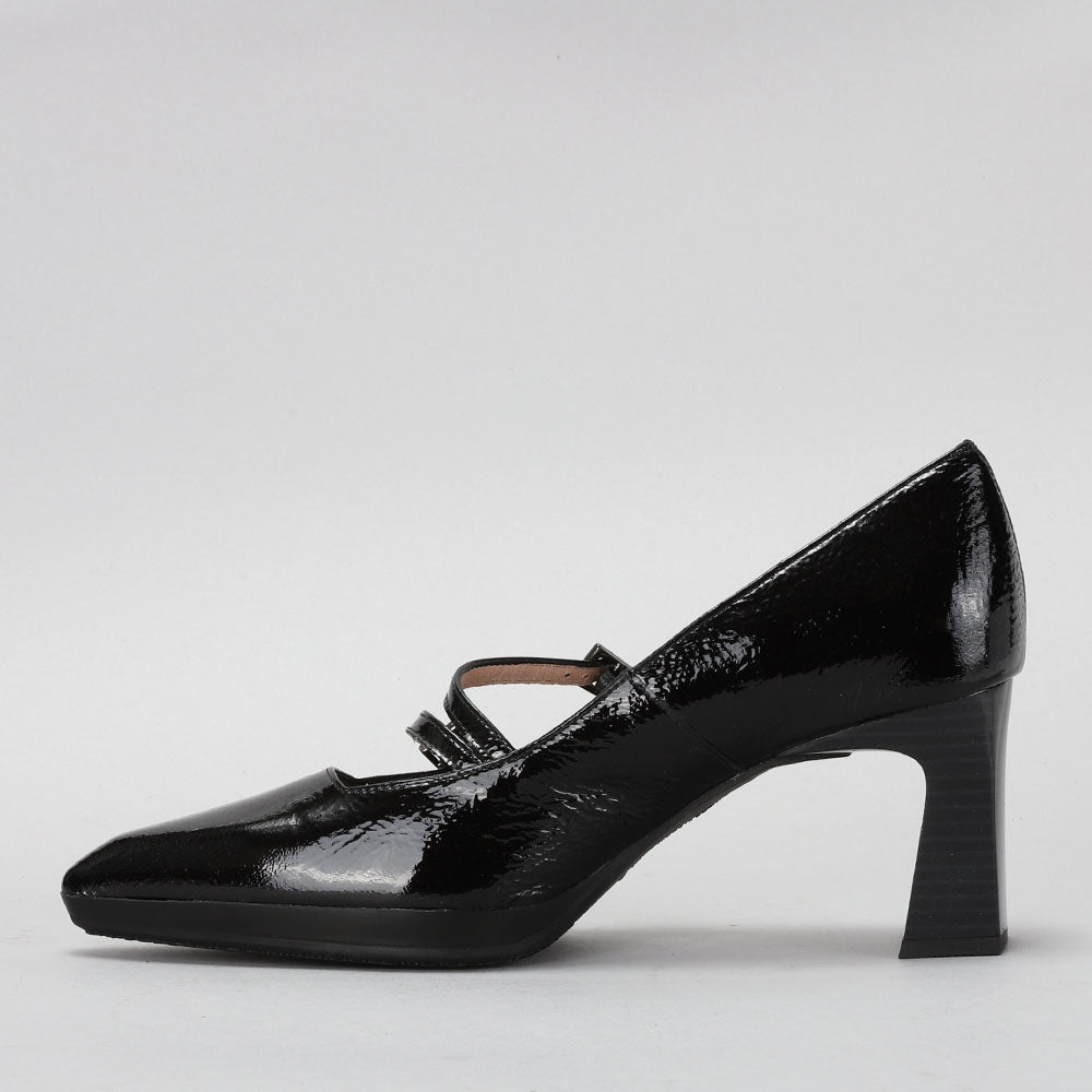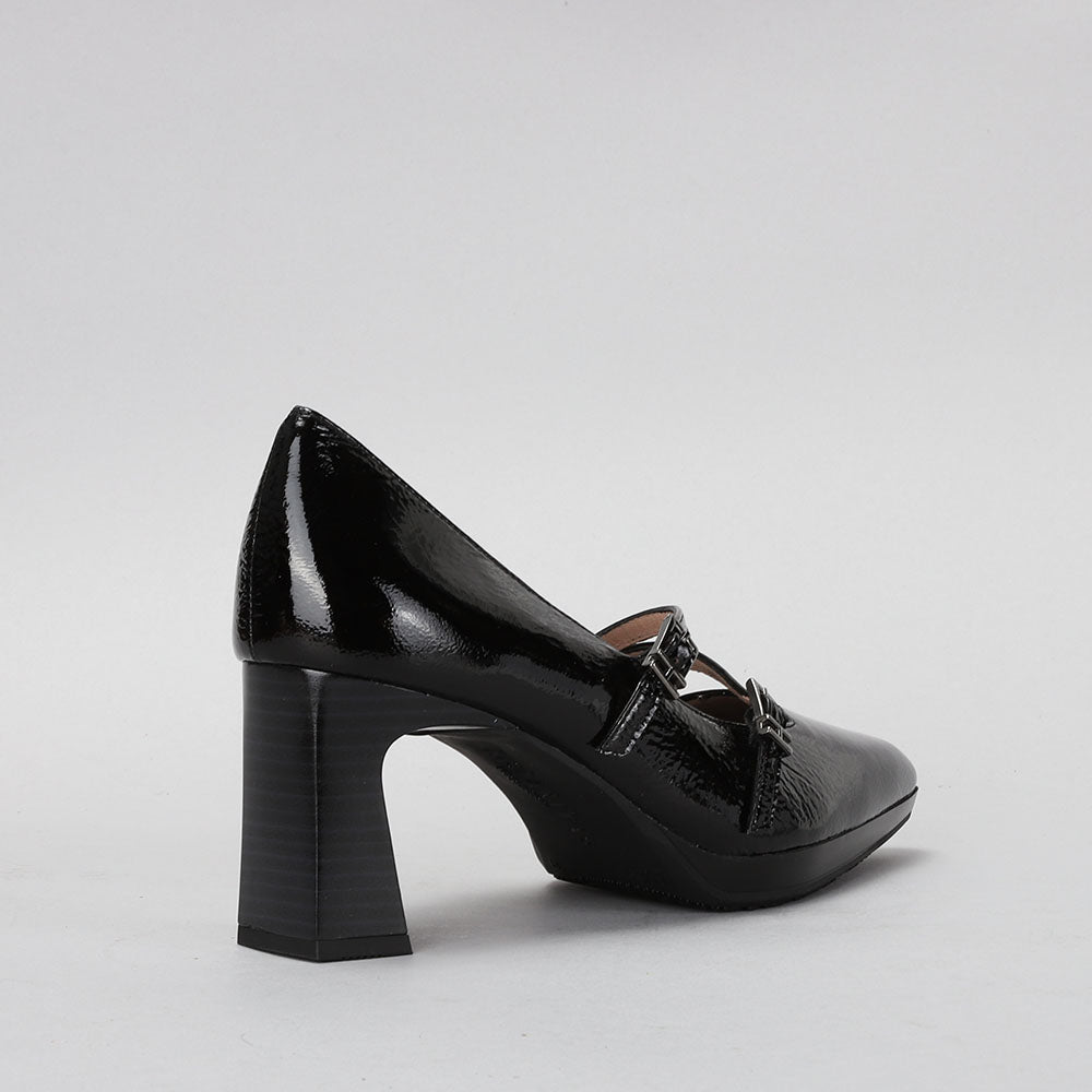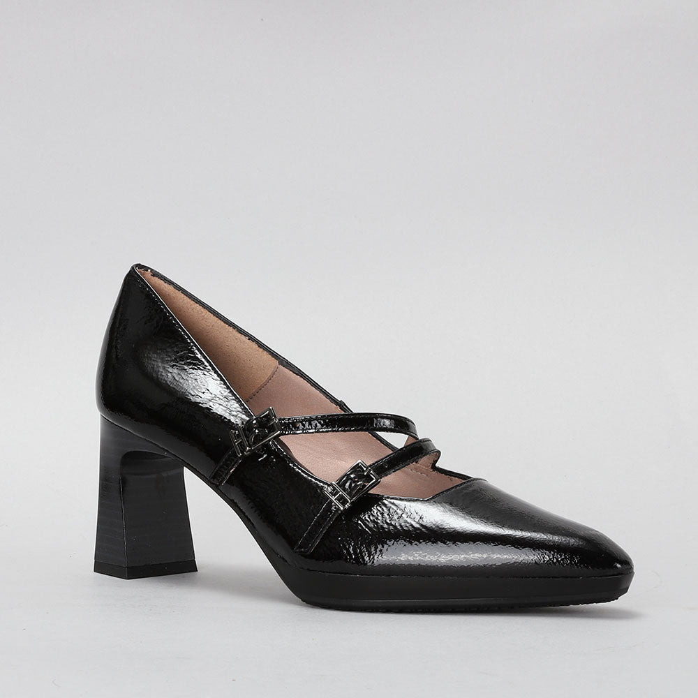 Mary Jane shoe with wide heel, in patent leather effect and square toe. Designed with 2 thin crossed straps with buckle fastening on the instep. Heel height of 7 cm .