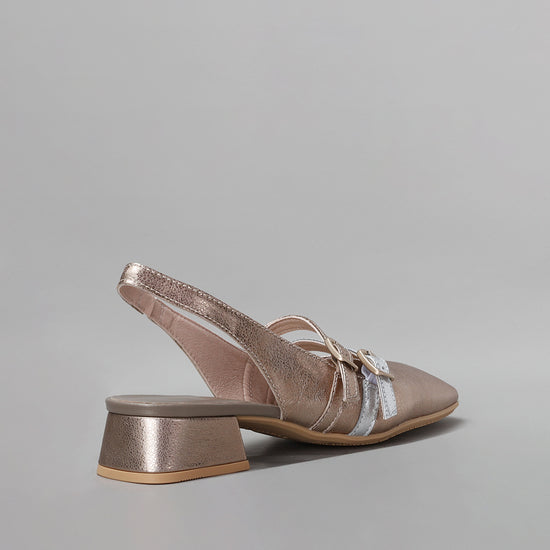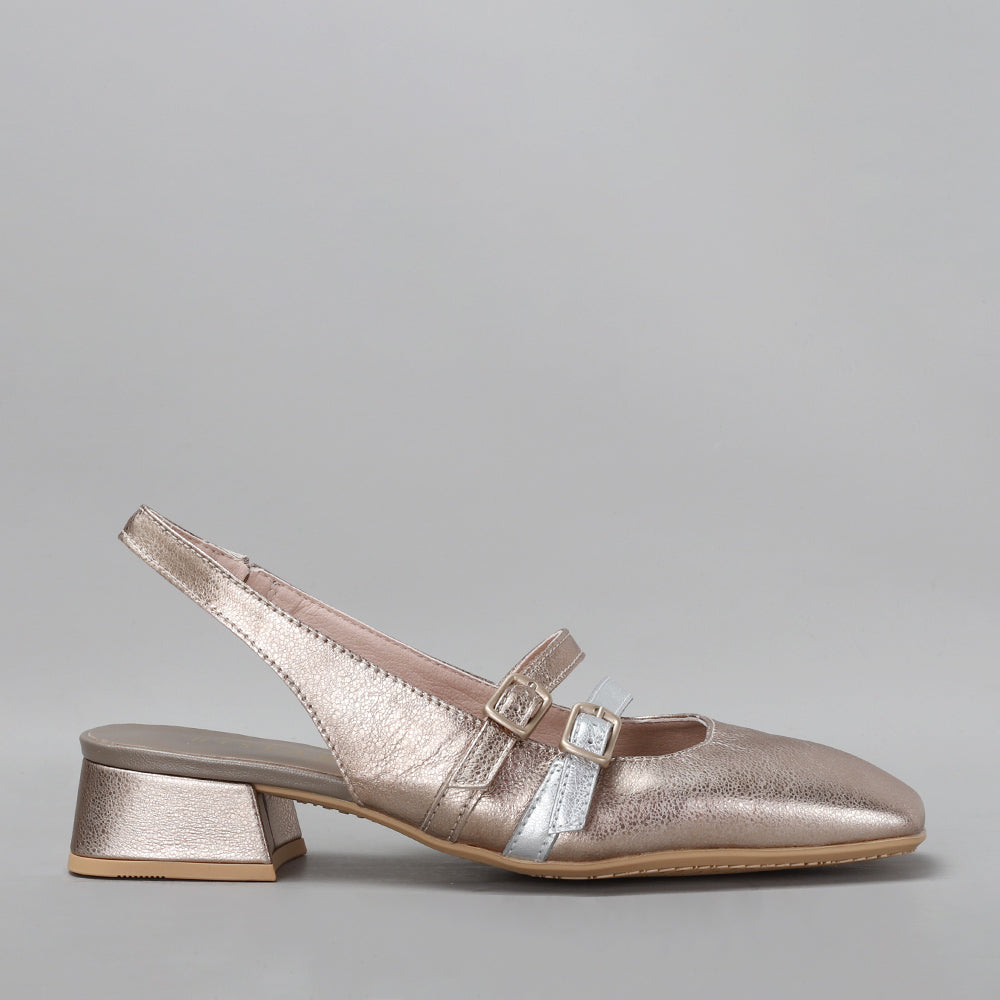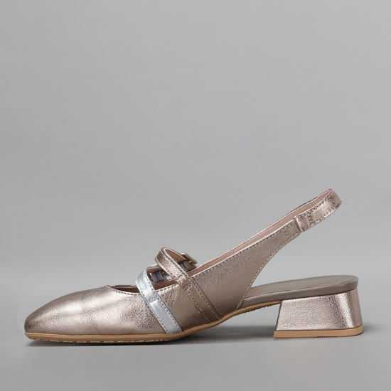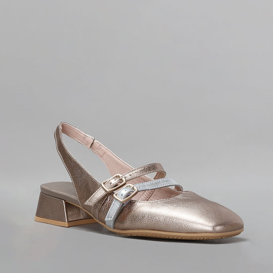 Leather slingback shoe with a square toe finish and a 3 cm high heel. This model, ballerina style, features two parallel thin straps with buckle fastening on the instep allowing a perfect fit to the foot. This shoe incorporates the Triflow technology, a triple cushioning that provides a padded effect on the tread.