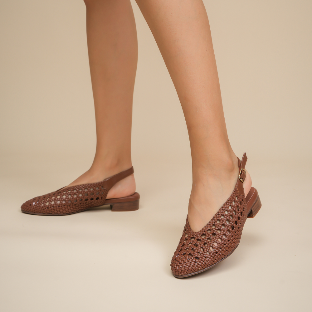 Step into effortless elegance with the Camila. Designed with a breathable woven upper and sleek slingback silhouette, this versatile flat blends comfort and timeless charm. Finished with a low stacked heel and adjustable strap for all-day ease — perfect for sunny days and casual outings.