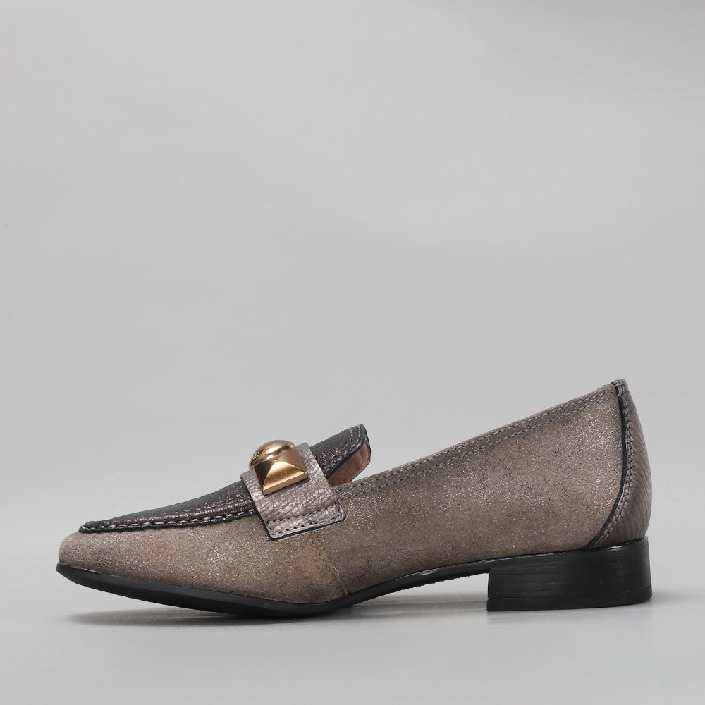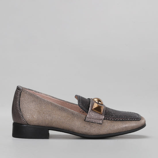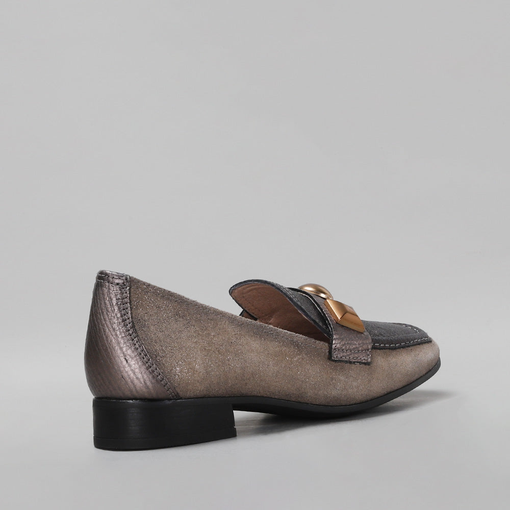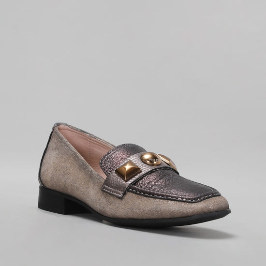 KENIA HI233132 by HISPANITAS, is an elegant Spanish loafer, featuring a buttery soft leather upper and unique metallic embellishments. KENIA will elevate any ensemble and offers triple underfoot gel cushioning ("TRIFLOW" Technology), for all day comfort.
