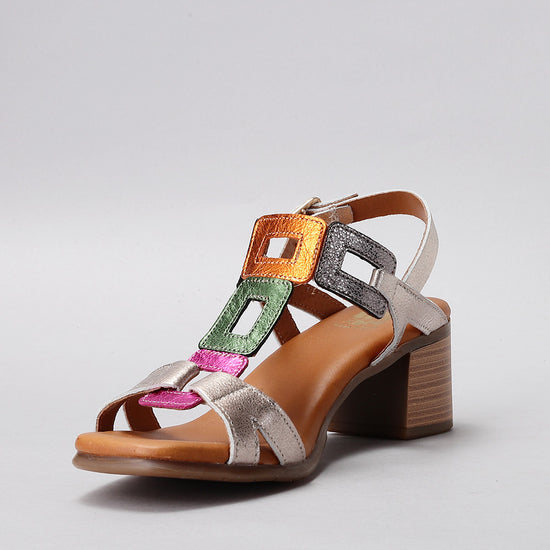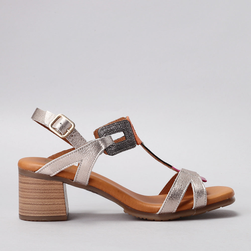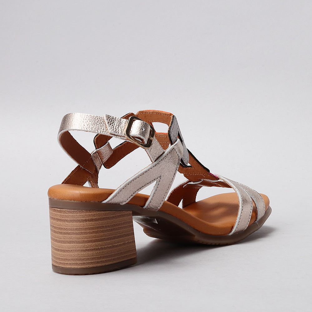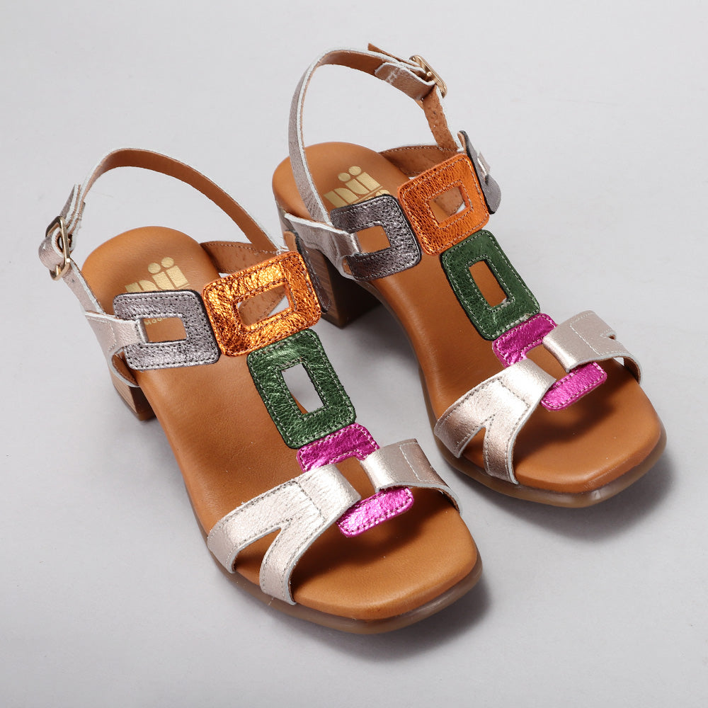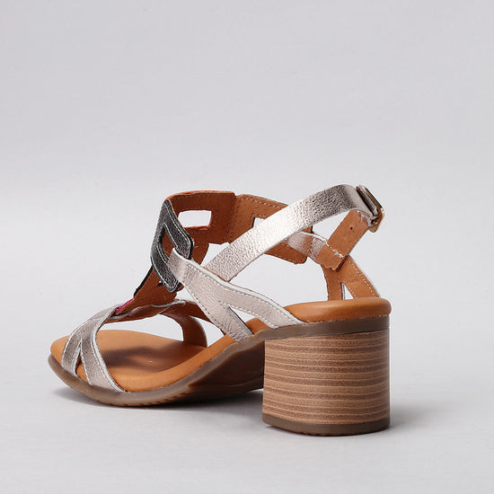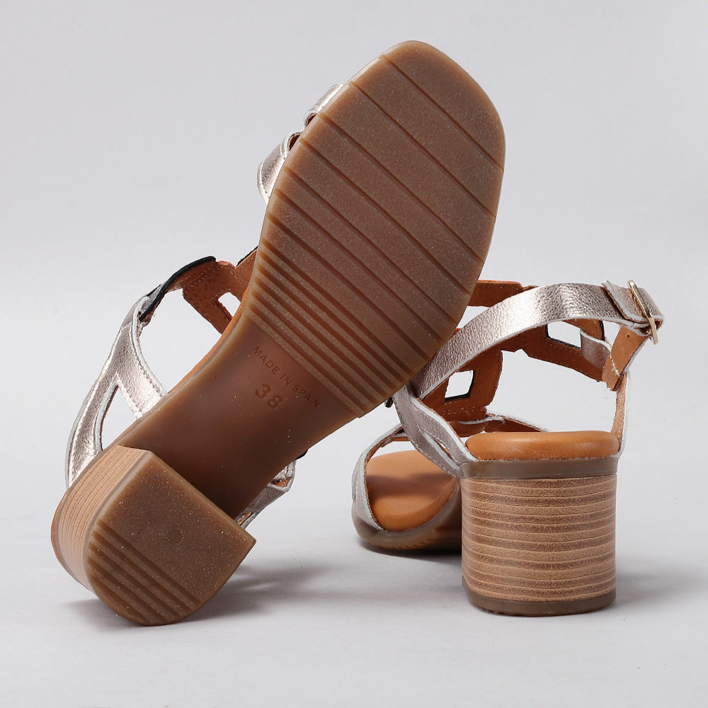 Crafted in a soft metallic leather finish, this elegant sandal features geometric cut-out straps that add a bold, contemporary touch. The mid-height block heel provides a perfect balance of lift and comfort, while the cushioned insole ensures effortless wear all day long. Finished with an adjustable buckle strap for a secure fit, the Clara is an ideal choice for both daytime polish and evening allure.