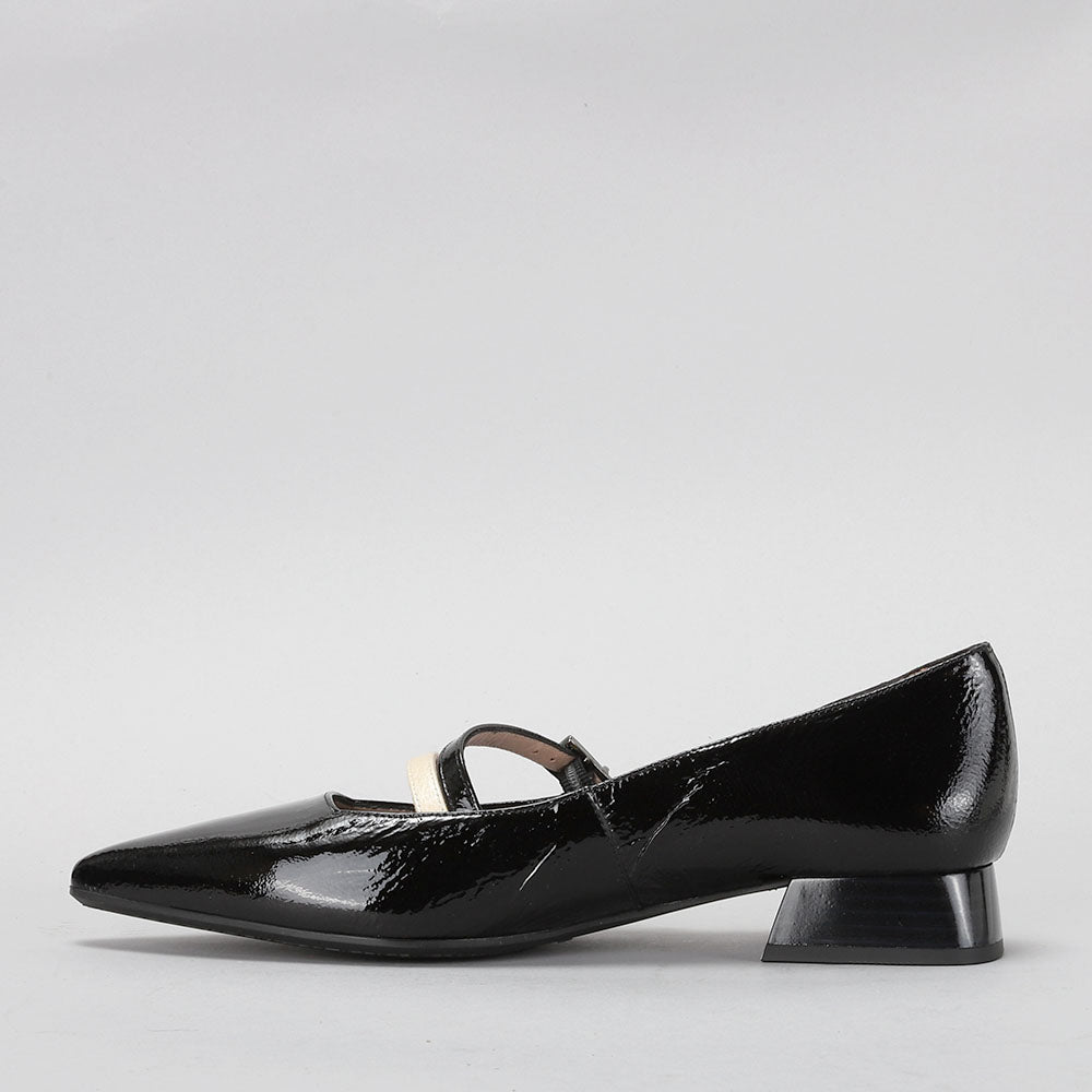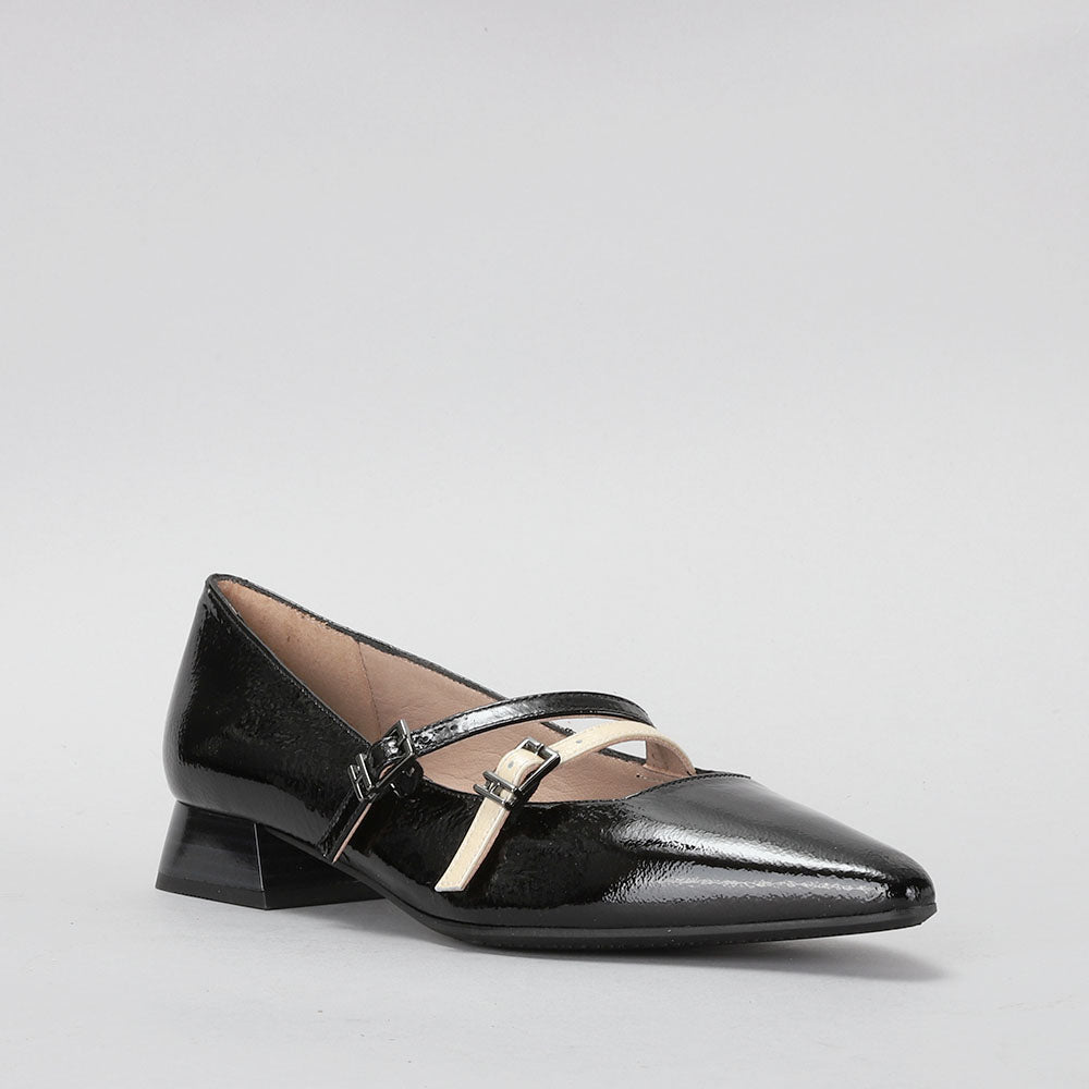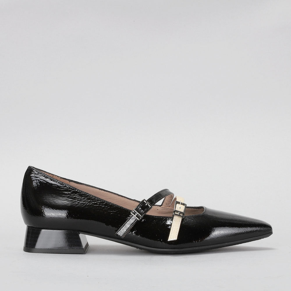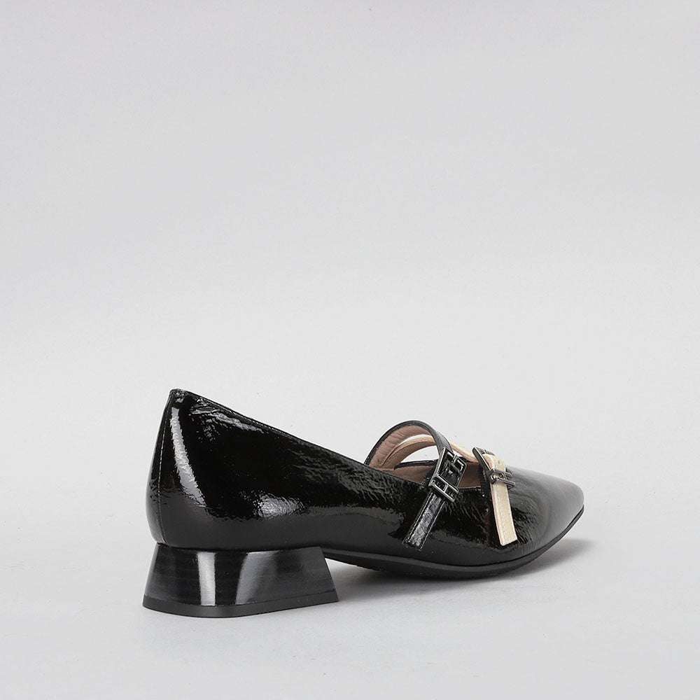 Leather slingback ballerina with a 2.5 cm heel. It is designed with 2 thin straps with buckle fastening, allowing a perfect fit to the foot and creating an elegant contrast.
