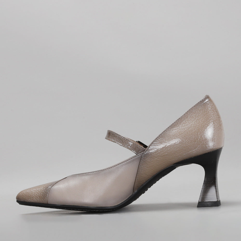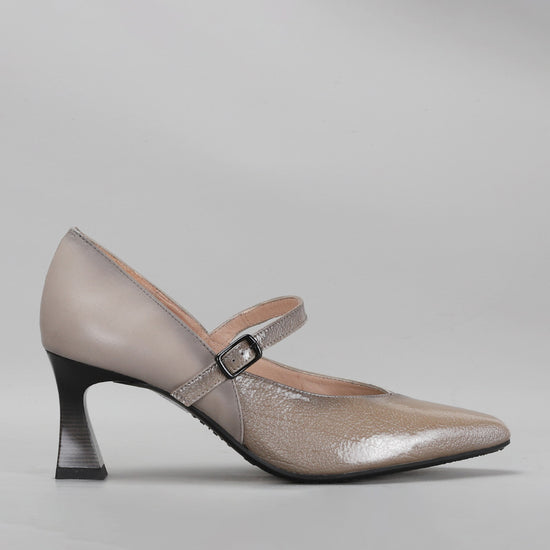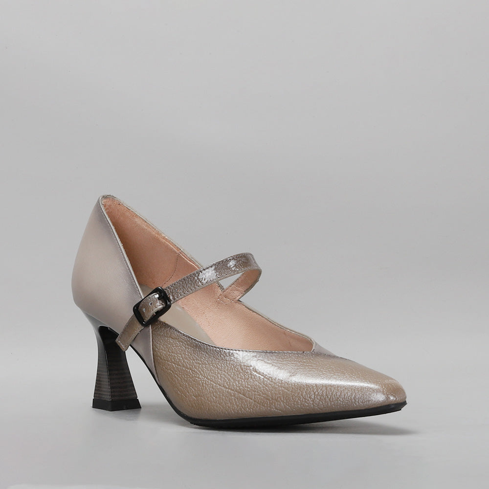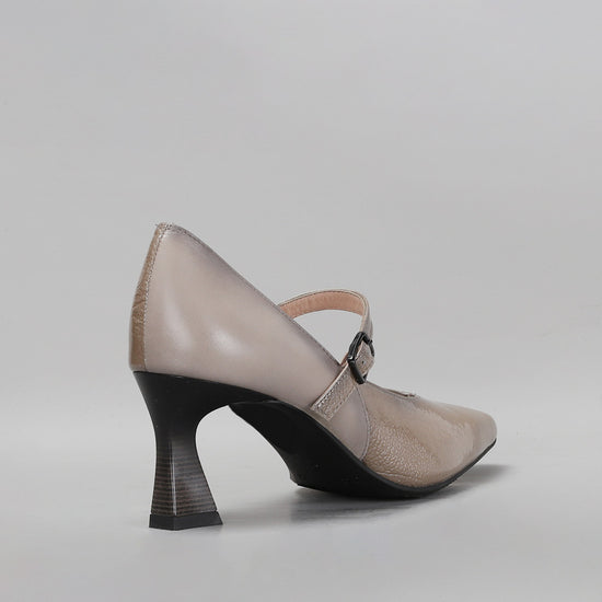 Hispanitas Dalia-123 HI232982 Taupe Mary Jane Pumps are gorgeous. Crafted from a combination of smooth and patent leathers, she features a slim Mary Jane buckled strap over the arch, a gently pointed toe and stunning flared heel that works like a block heel. Triple padding underfoot thanks to TRIFLOW technology provides comfort for all day wear with every step. Handmade in Spain.
