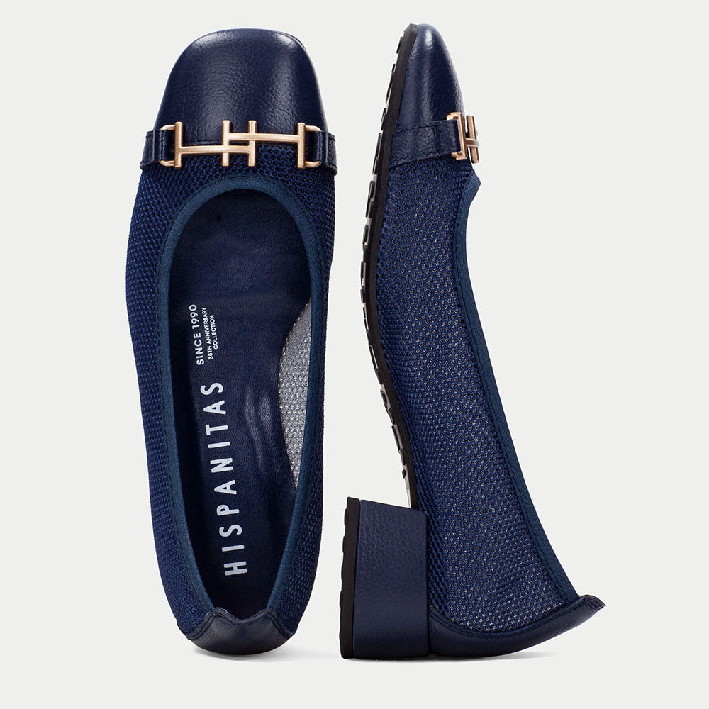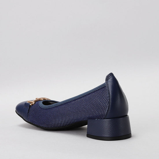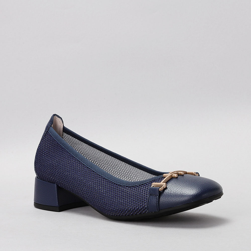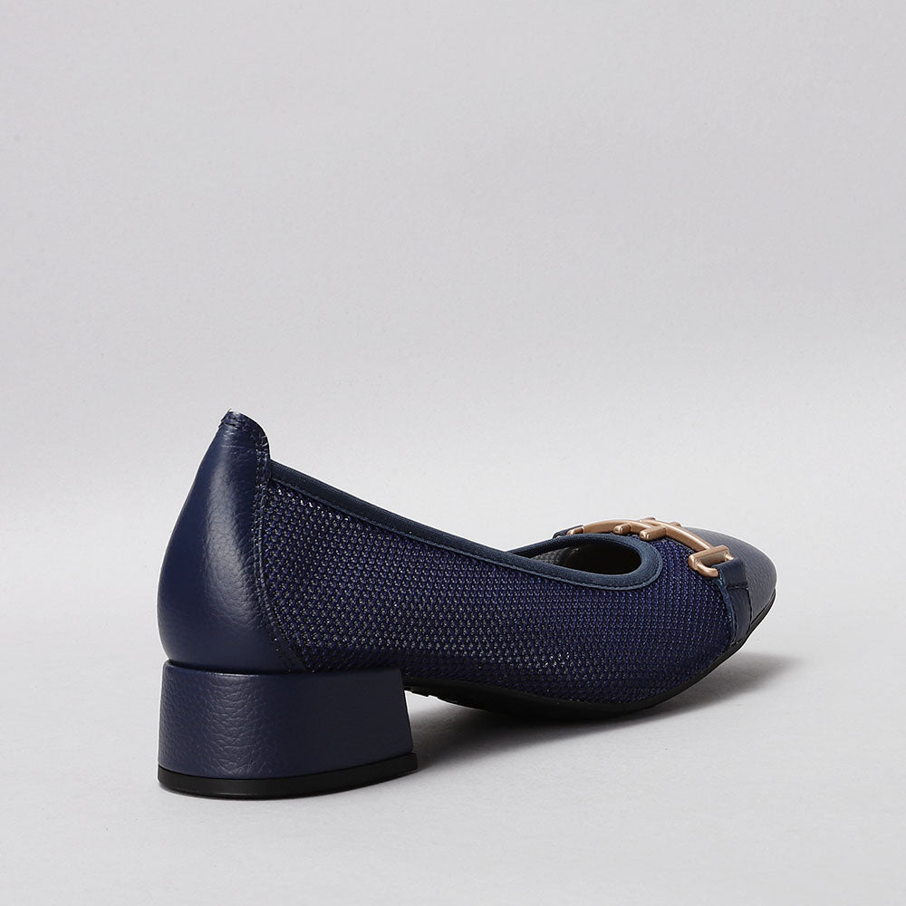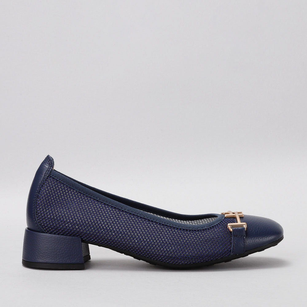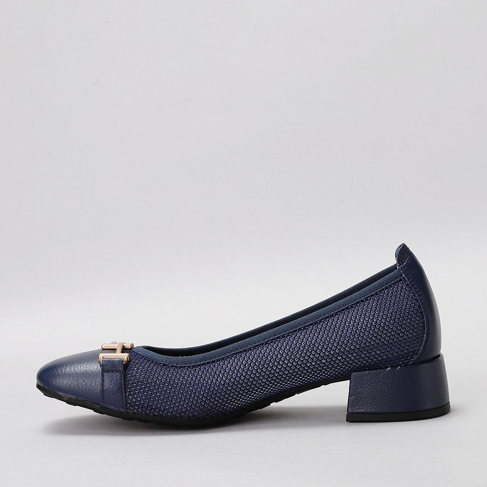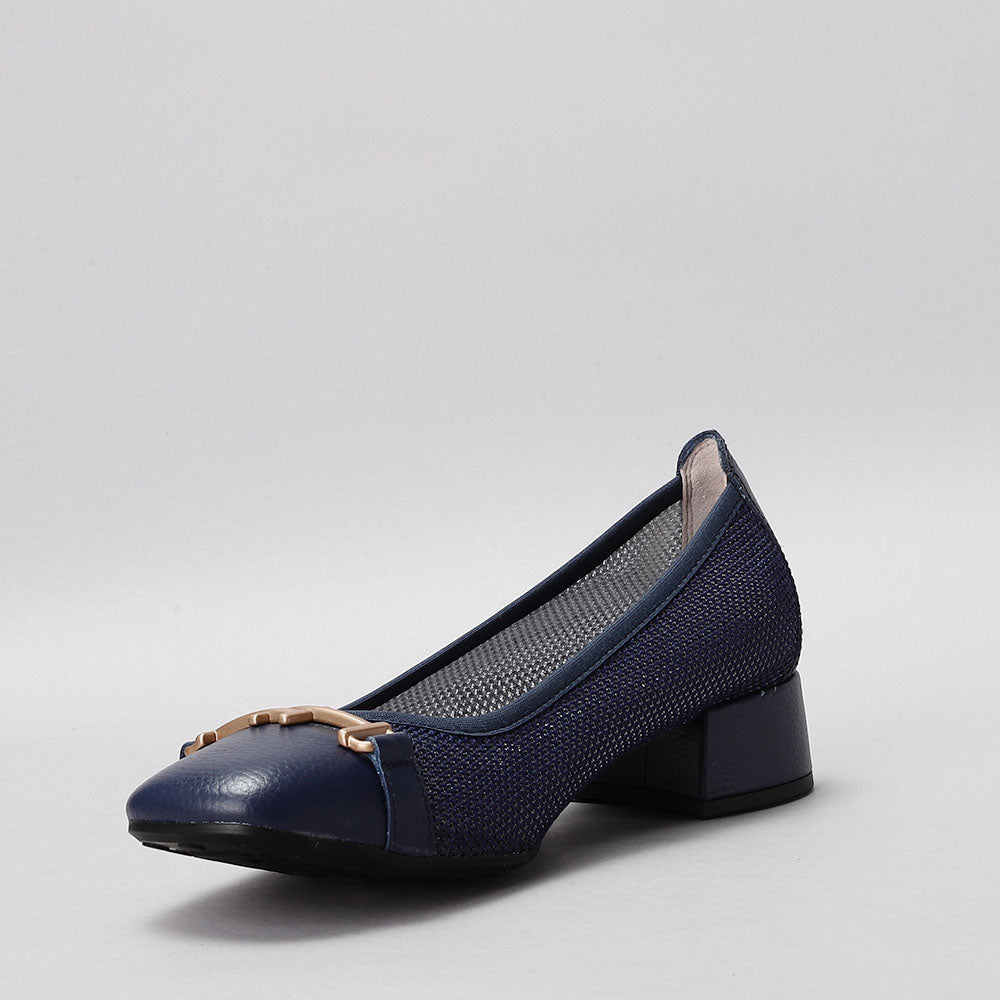 Refined and versatile, this navy blue dress shoe blends classic elegance with modern comfort. The textured fabric upper pairs seamlessly with a smooth leather toe cap, while a metallic decorative buckle detail adds a polished accent. Designed with a low block heel for easy wear, it’s finished with a breathable mesh lining. Ideal for professional settings or elevated everyday style, this shoe offers understated sophistication with a touch of contemporary charm.
