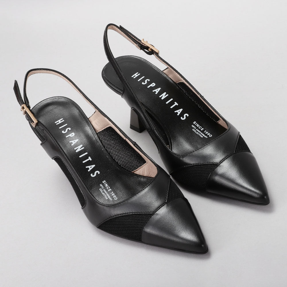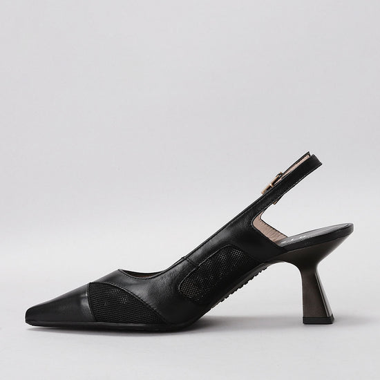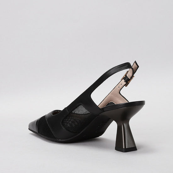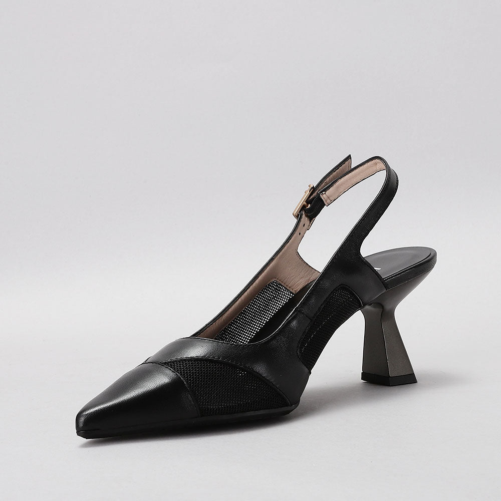 This elegant slingback heel combines modern style with timeless sophistication. Designed in a warm tan shade, it features a pointed toe with smooth leather accents, complemented by breathable mesh panels for a light and airy feel. The adjustable ankle strap with a small buckle ensures a secure and comfortable fit, while the unique geometric block heel adds a contemporary twist. Perfect for both professional and casual settings, this heel pairs beautifully with dresses, skirts, or tailored trousers. A versatile choice, it balances comfort and style, making it an ideal addition to any wardrobe for day-to-night wear.