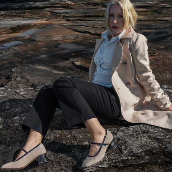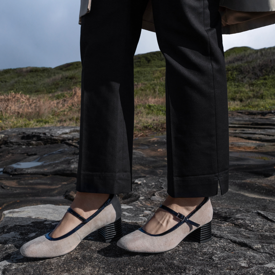 Zafira is a vintage-inspired heel featuring a soft suede upper, sleek patent leather strap and trim, and a unique ribbed block heel for standout elegance.