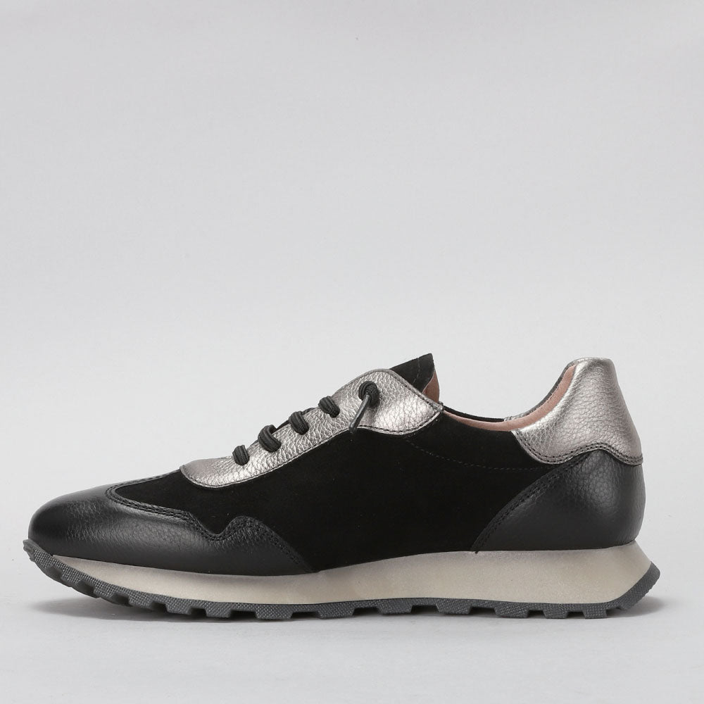 Sneaker with elastic lace-up fastening and an original combination of materials. This model incorporates the Triflow technology, a triple cushioning that provides a padded effect when walking. It features a removable insole.