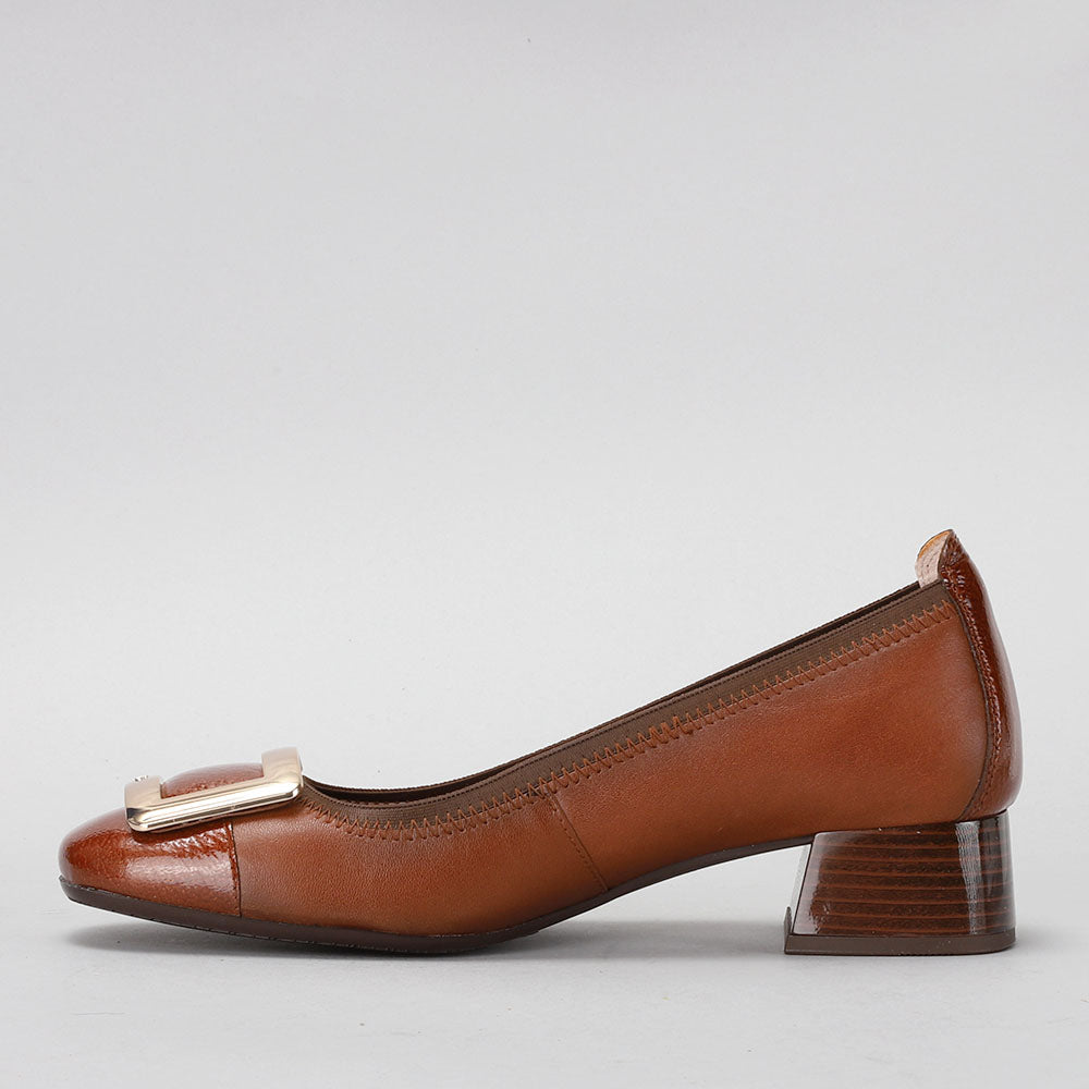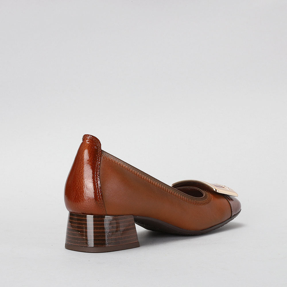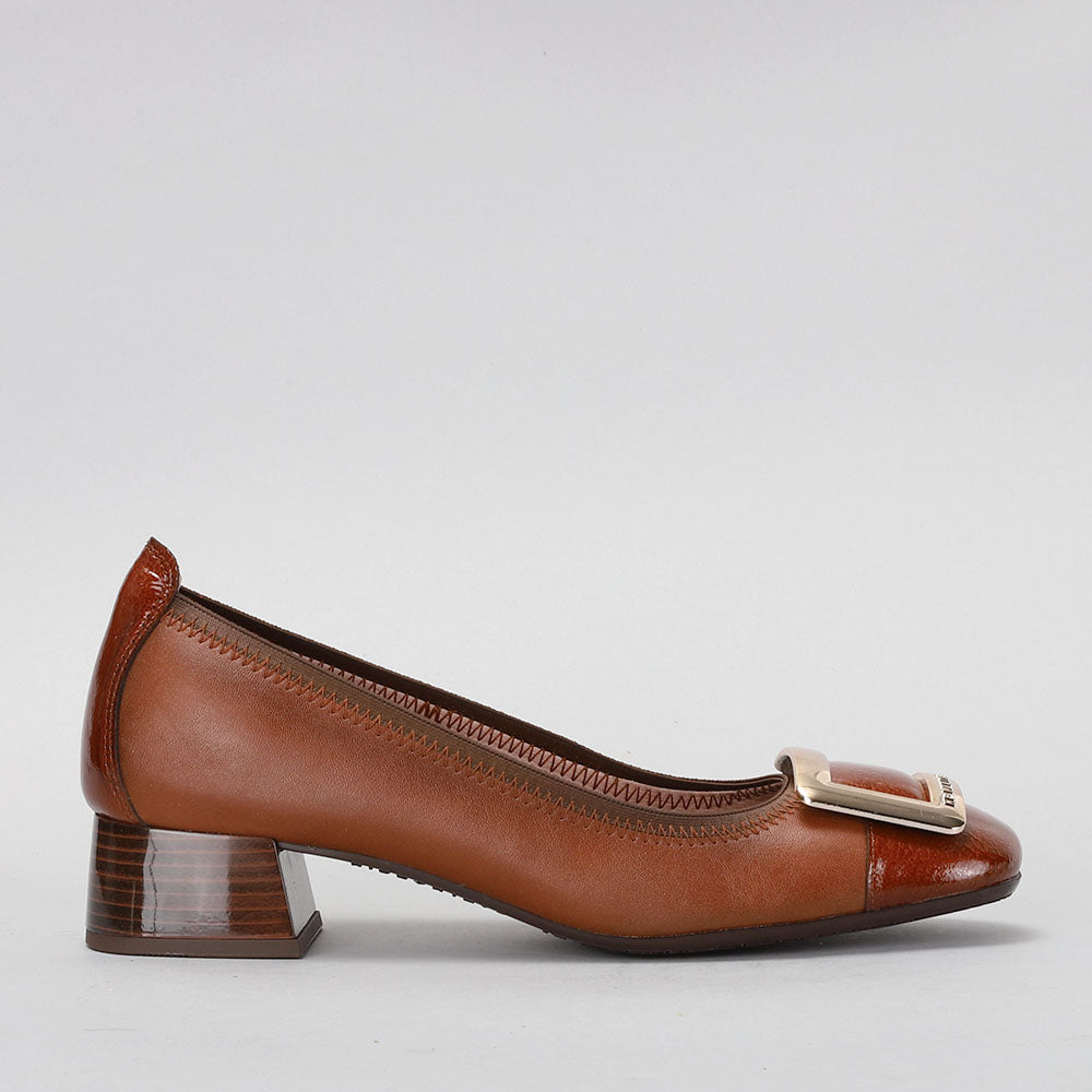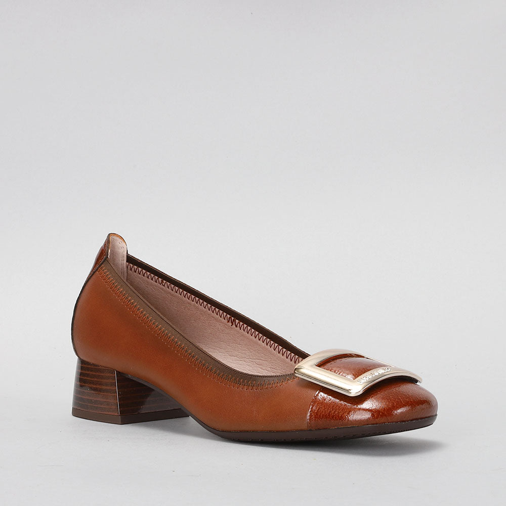 Ballerina shoe made of leather with a 3 cm block heel. Elastic trim and maxi buckle decoration on the toe. This shoe incorporates Triflow technology that cushions each step, providing flexibility and comfort in the tread, thanks to its triple padding.