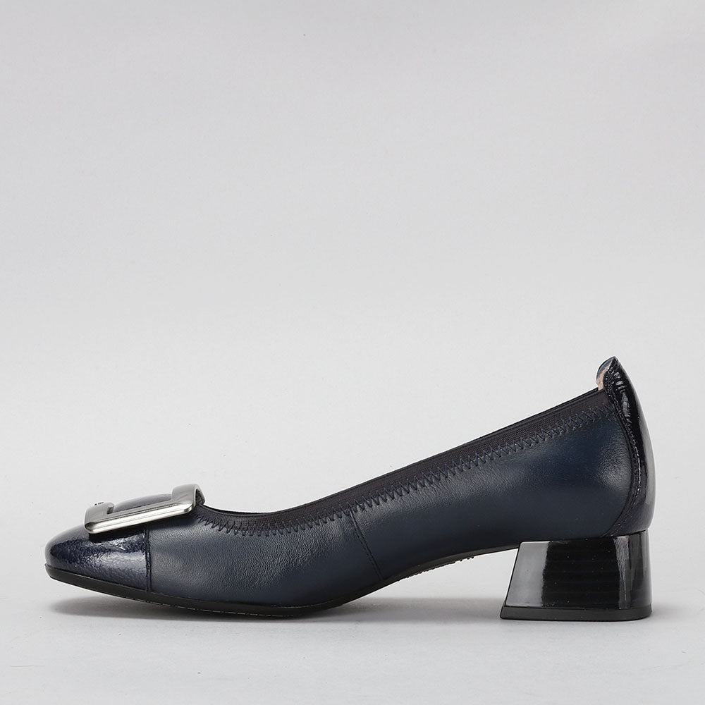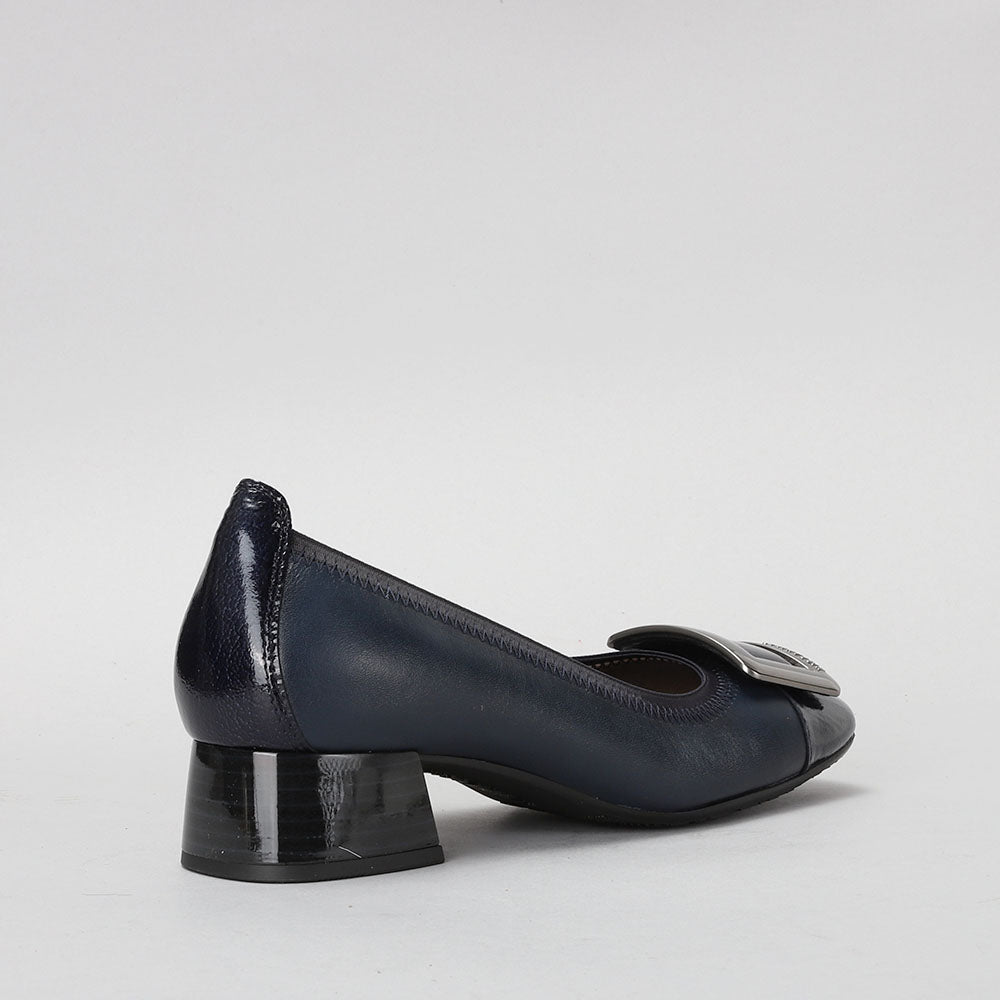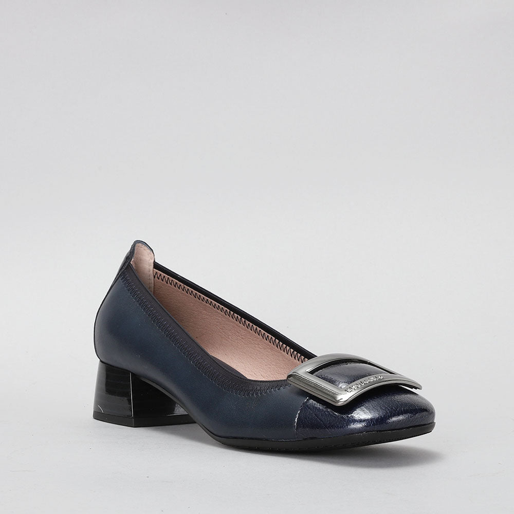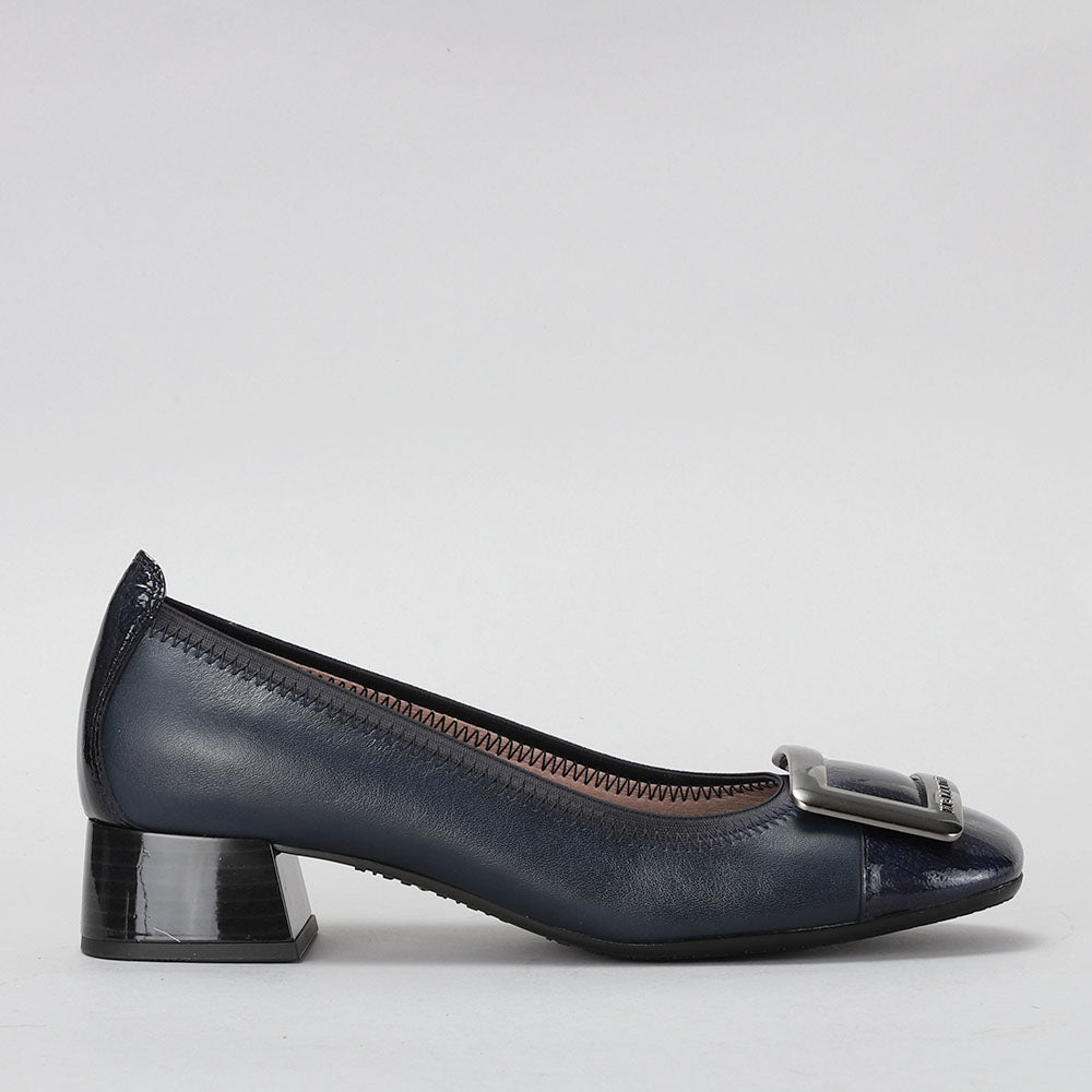 Leather ballet flat with a 3.5 cm heel. This model features a maxi buckle with the Hispanitas logo on the toe. Additionally, it includes triple padding, called Triflow, which provides a cushioned effect when walking.