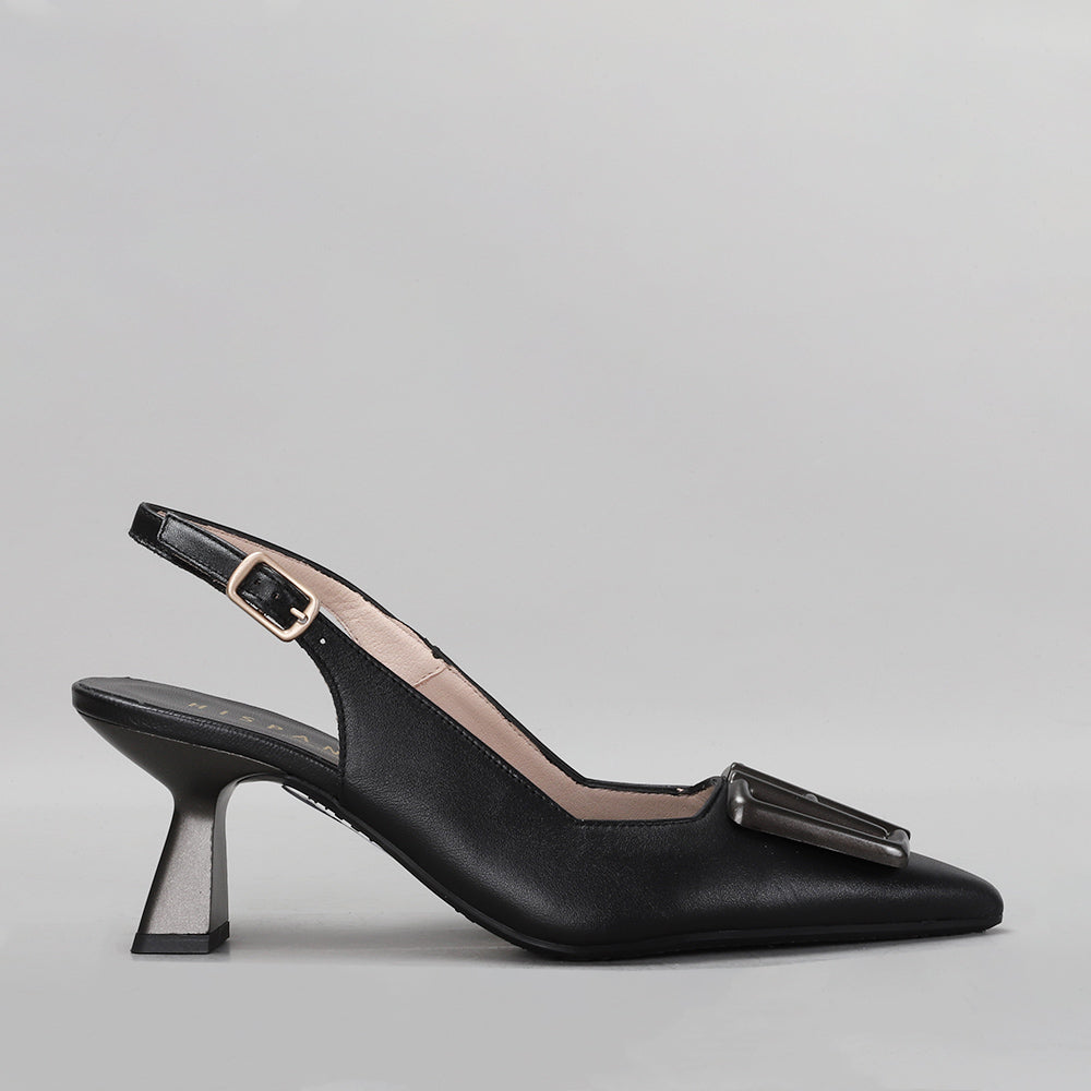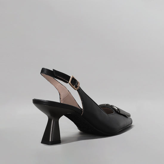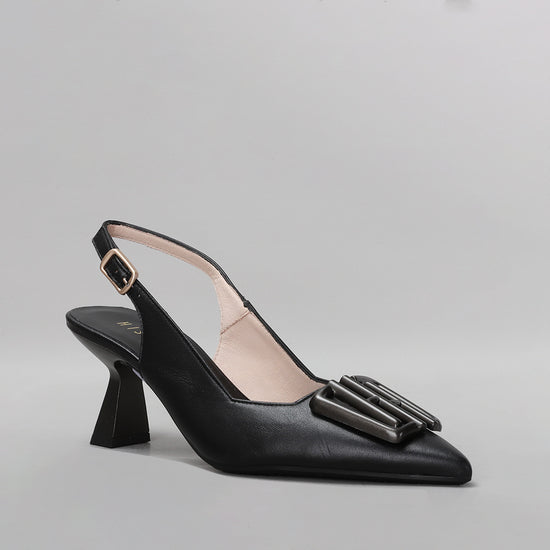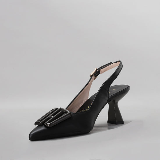 Leather slingback shoe with pointed toe finish and a 6 cm high heel. This design features the special detail of the maxi ornament with the double H on the toecap and a buckle fastening on the side. The Triflow technology provides a padded effect on the tread.