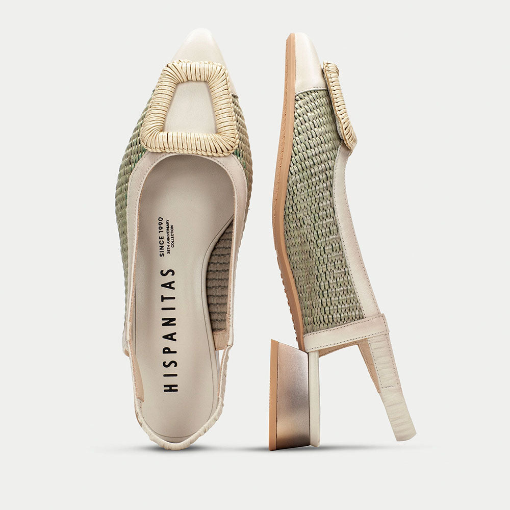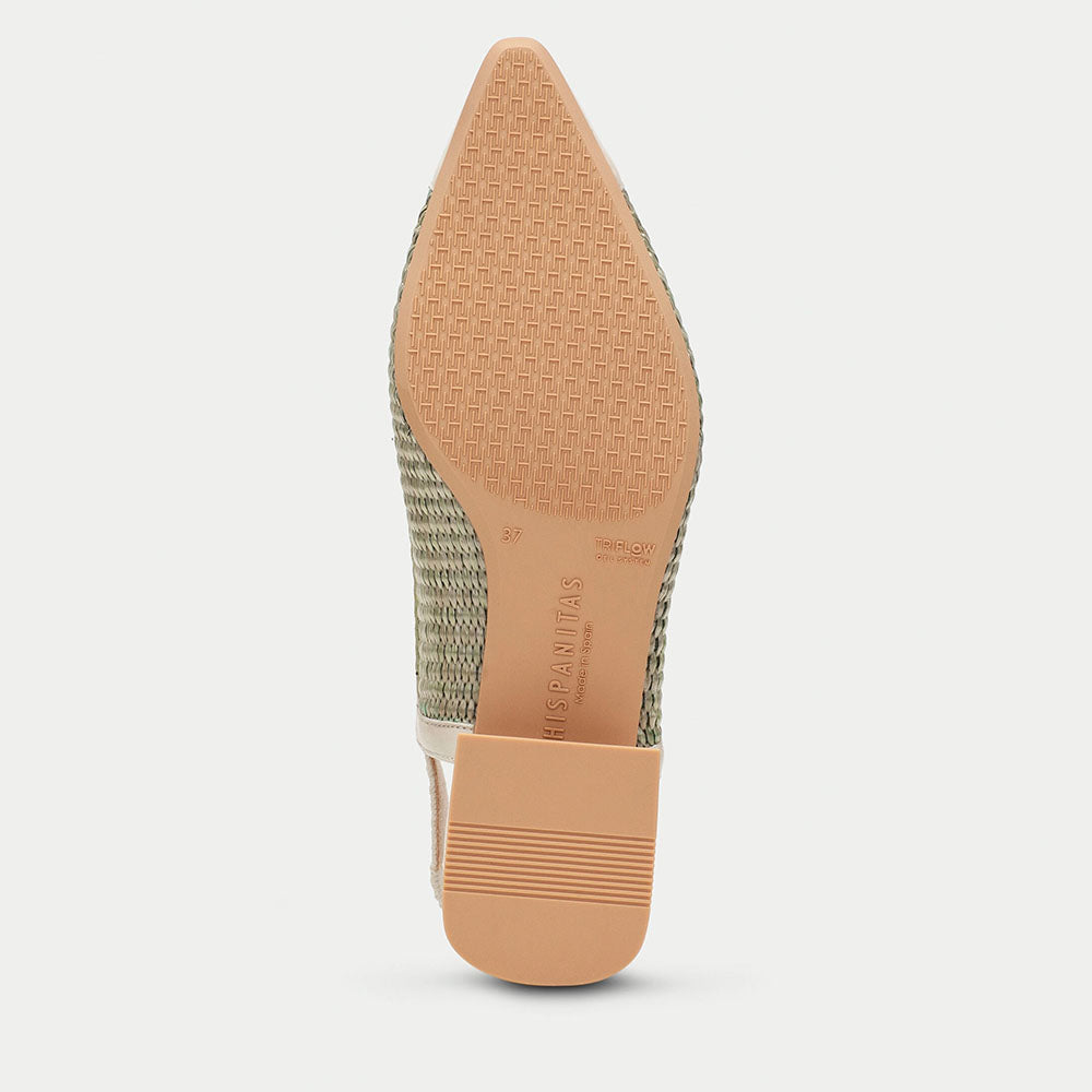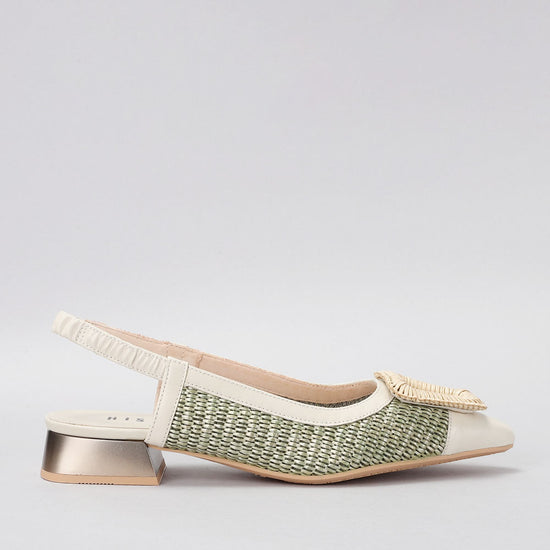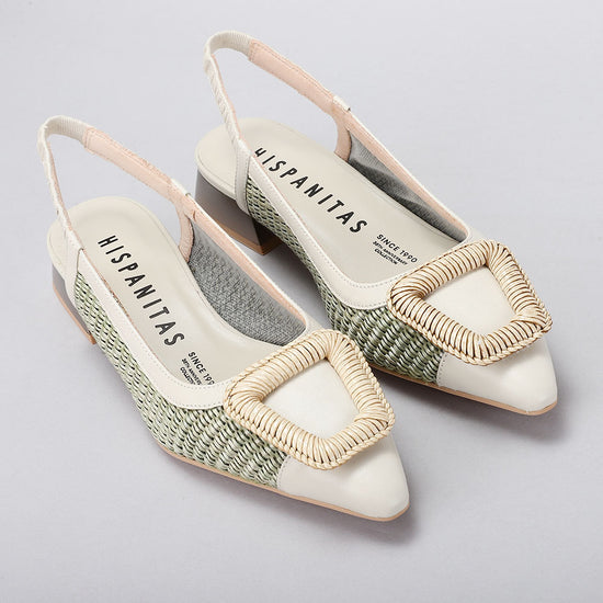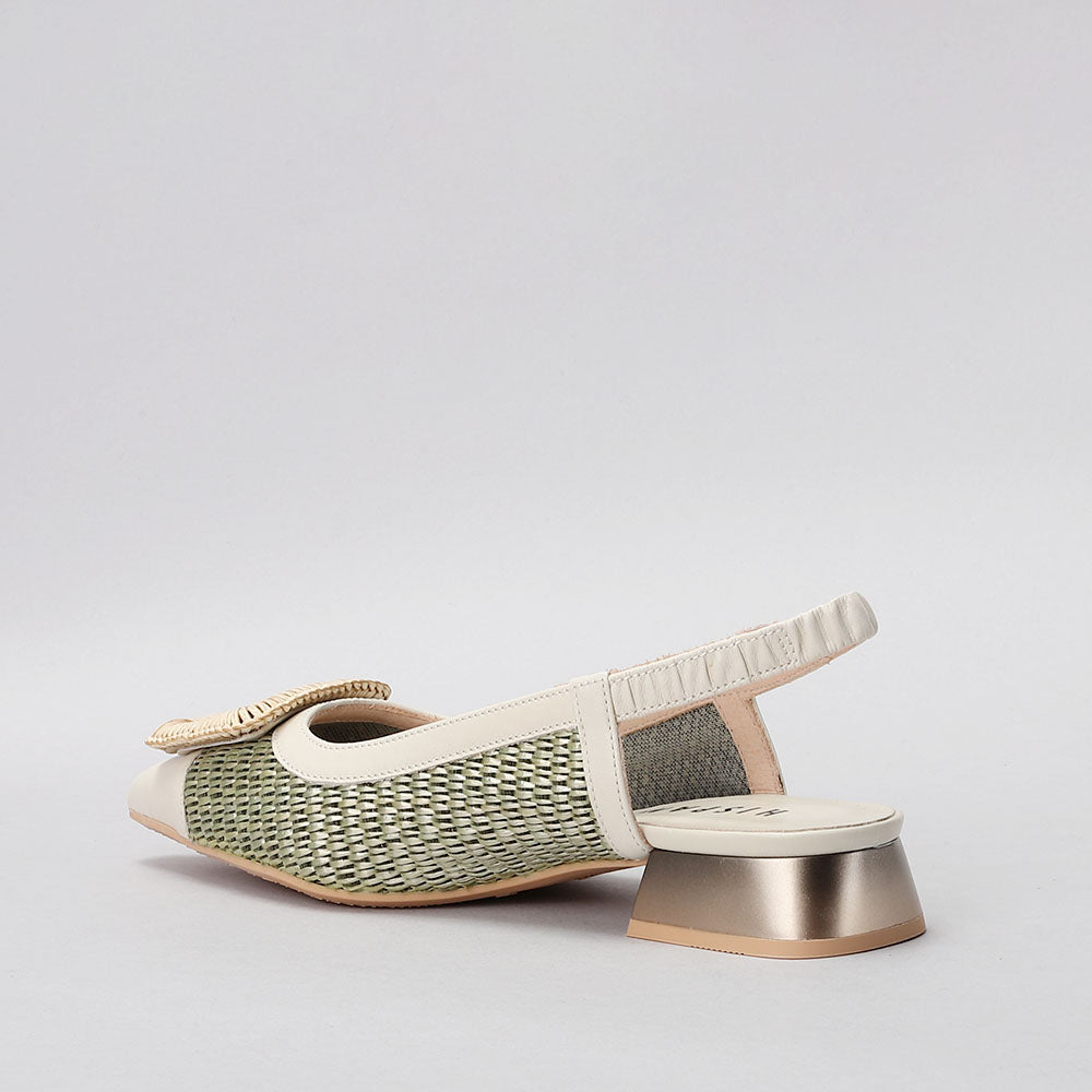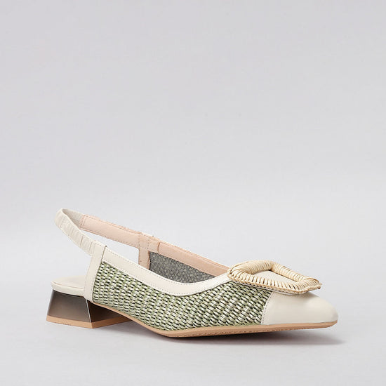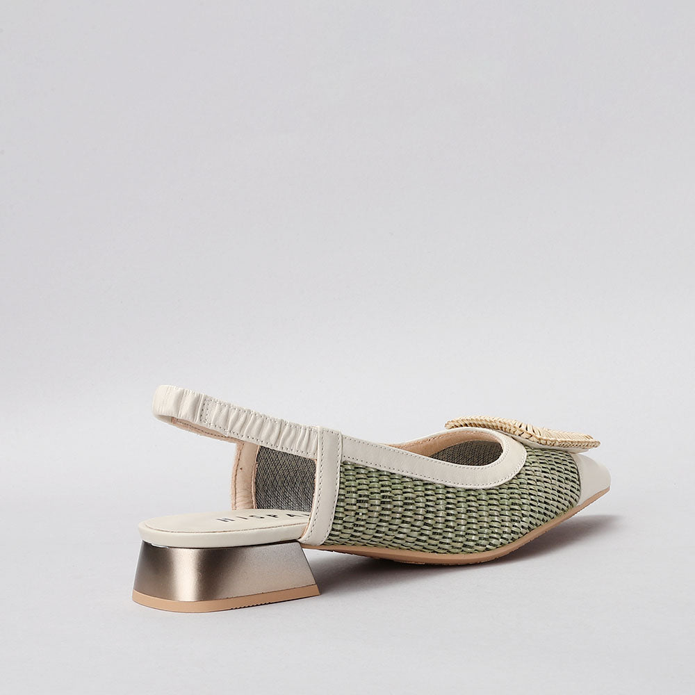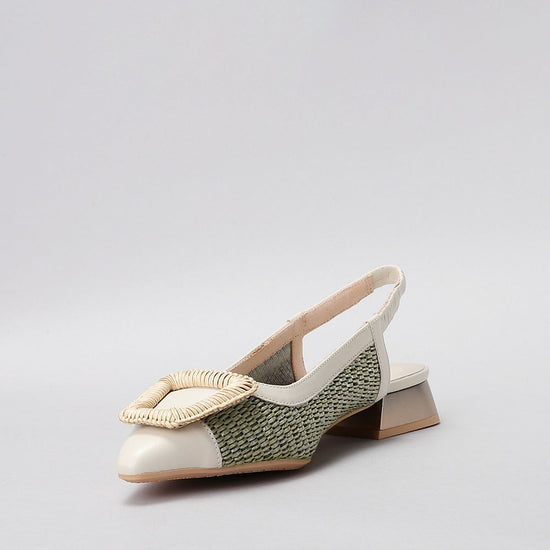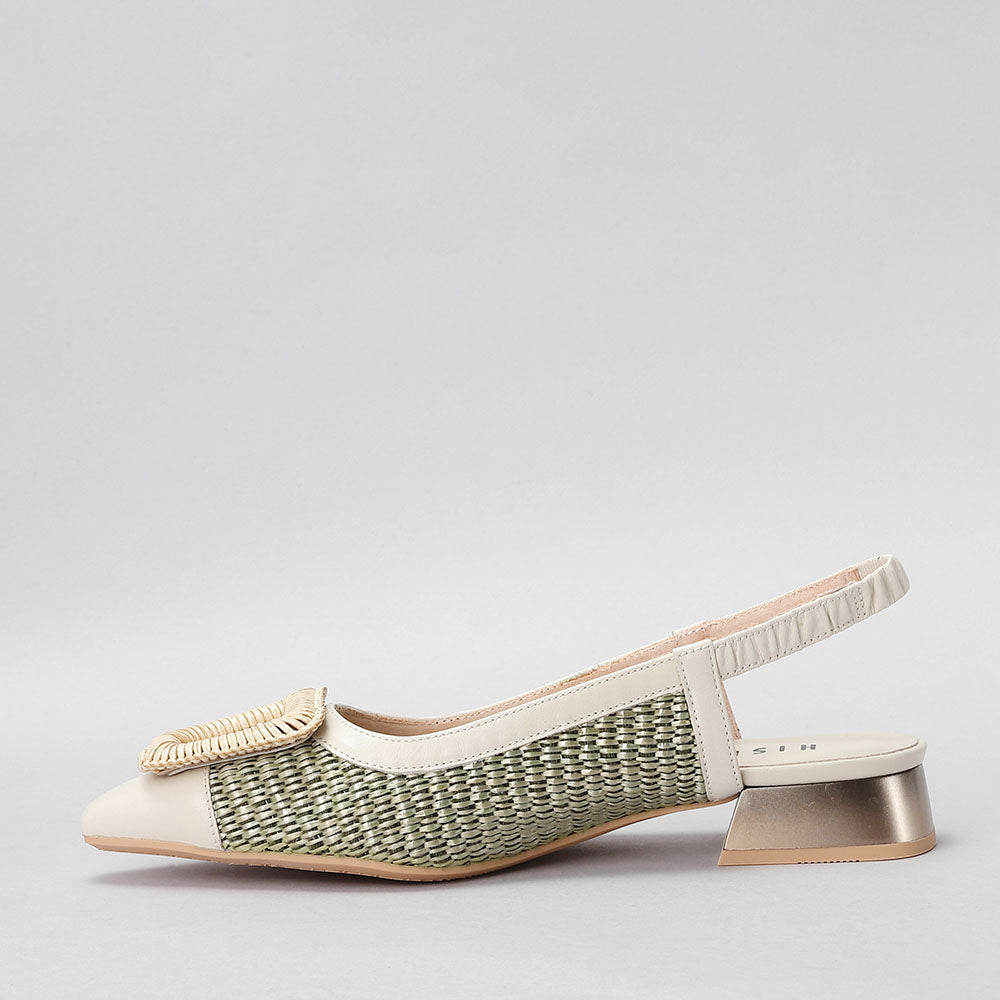 This chic slingback shoe blends comfort and elegance with a modern twist. Crafted in a soft latte tone, it features woven eucalyptus detailing on the sides for a fresh, textured look. The pointed toe is adorned with a stylish raffia-inspired accent, adding a touch of uniqueness. A low geometric heel provides subtle lift while ensuring all-day comfort. Perfect for casual outings or dressier occasions, this versatile shoe effortlessly complements both relaxed and refined outfits.